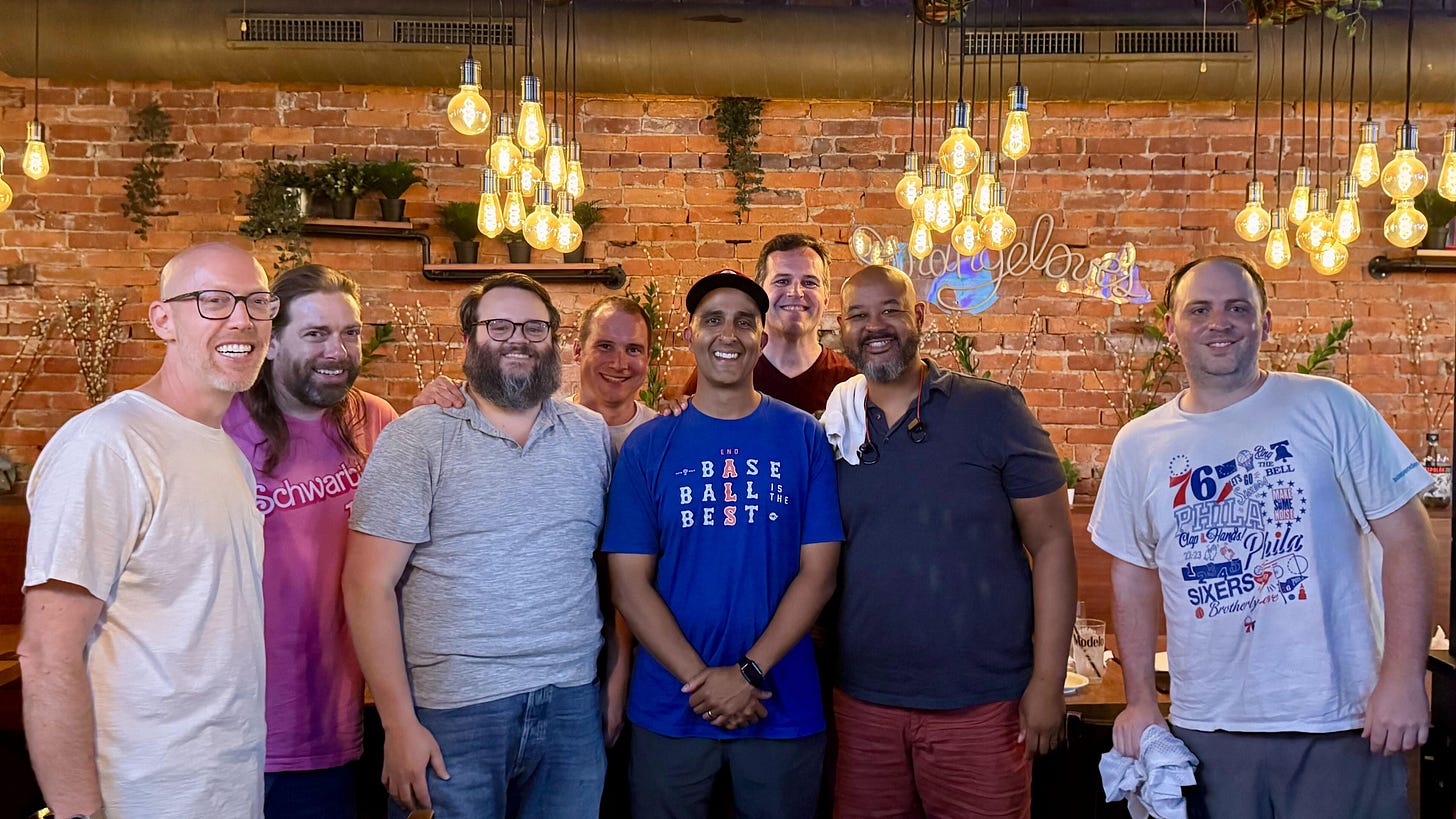 10. This bluesky post describes Dan perfectly as, “The center a thousand different circles on a venn diagram connecting us all.” If you were online and into Philly or sports or just journalism, you knew Dan, and you met a dozen other people because of him. Over the summer, a friend flew in from out of town for a business trip, and a group of us—all guys who have become online friends because of our shared Philly sports fandom—met for drinks at Strangelove’s in Center City. I invited Dan, knowing he might not come because of the illness and because he’d quit drinking a while ago, but there he was, walking through the door in his pink Schwarbie shirt. He was thrilled that the TVs behind the bar were showing Baywatch, a show that I used to think he loved ironically, but I don’t think he ever did anything ironically. Near the end of the night, he said, “So I guess you guys want to know what’s going on with my health.” We did, of course. And he told us it was looking good. That was the last time I saw him.
